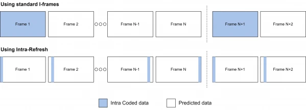 - 易出错的传输环境:涉及潜在不可靠网络(例如无线链路、互联网)的场景可受益于帧内刷新。如果数据包丢失并导致帧损坏,受影响区域将在较短的、预先设定的时间间隔(刷新周期)内逐步刷新并纠正,而不是让错误持续到下一个完整的 I 帧。