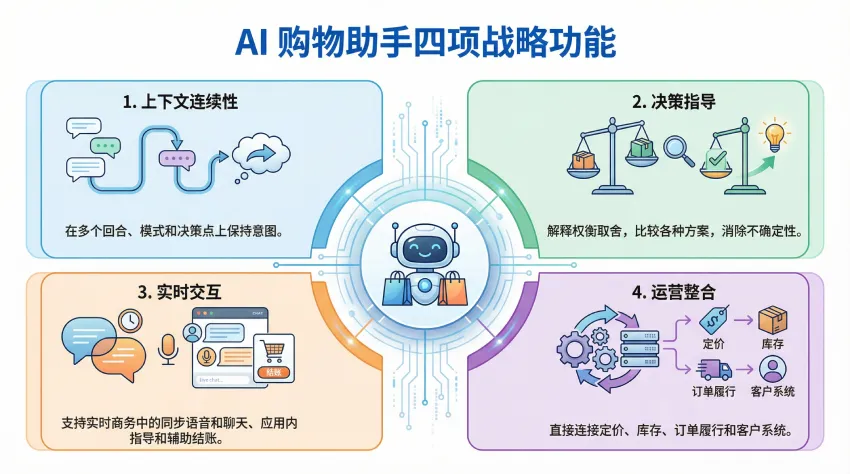 一款达到生产级别的 AI 购物助手必须执行四项战略功能:
