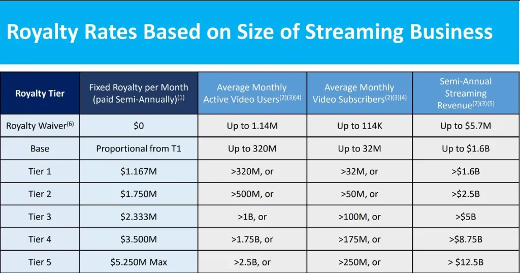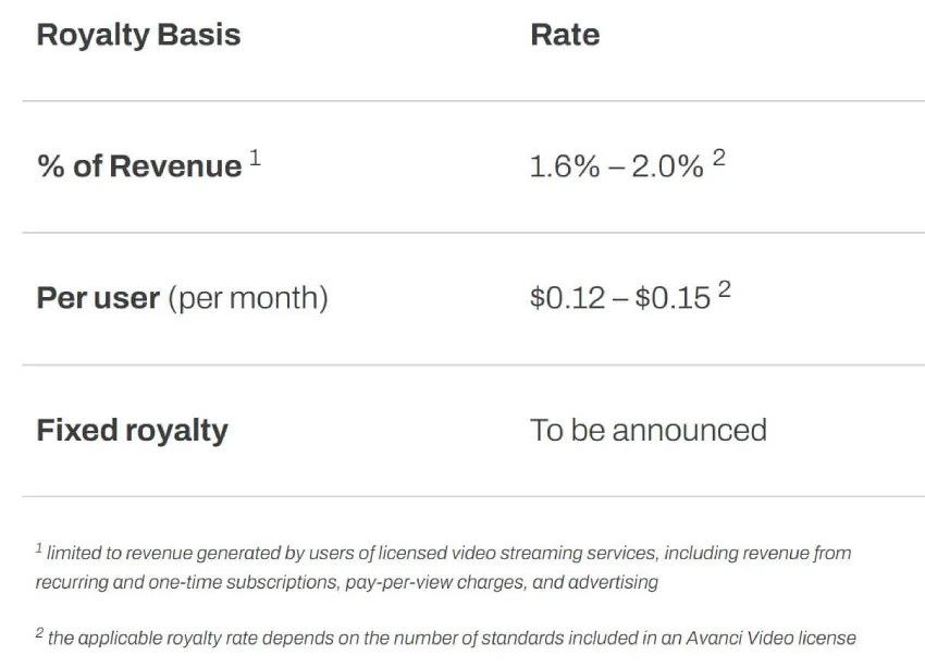 Avanci 提供三种计费方案供授权用户选择。按收入计费方案对使用一项授权技术收取流媒体收入的 1.6%,两项技术收取 1.8%,三项或更多技术收取 2.0%。按用户计费方案对使用一项技术每月收取 0.12 美元,两项技术每月收取 0.135 美元,三项或更多技术每月收取 0.15 美元。第三种固定费用方案仍在最终确定中。