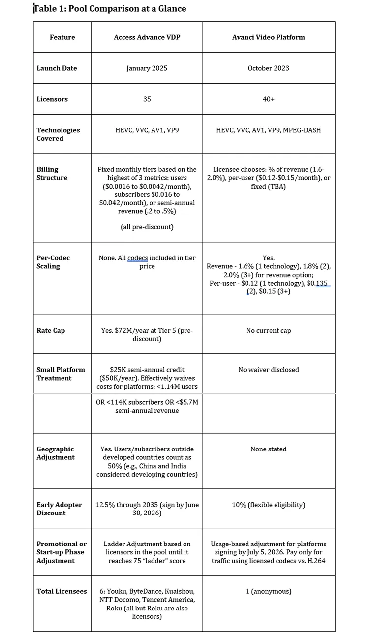 你可能知道,Avanci Video 并非唯一向视频流媒体服务收取编解码器使用费的专利池或平台。Access Advance 的视频分发专利池于 2025 年 1 月启动,涵盖 Avanci 平台中的全部四种编解码器(但不包括MPEG-DASH)。