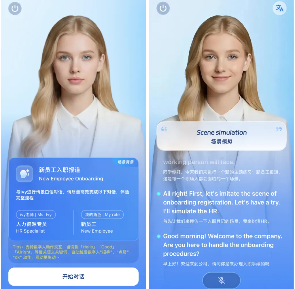 - 真实情景还原:客户可根据需要灵活设定口语练习场景的剧情/学习内容(如机场值机、外企面试、雅思模考等),为用户提供“遇到问题才学,解决问题即停”的定制化技能补丁。