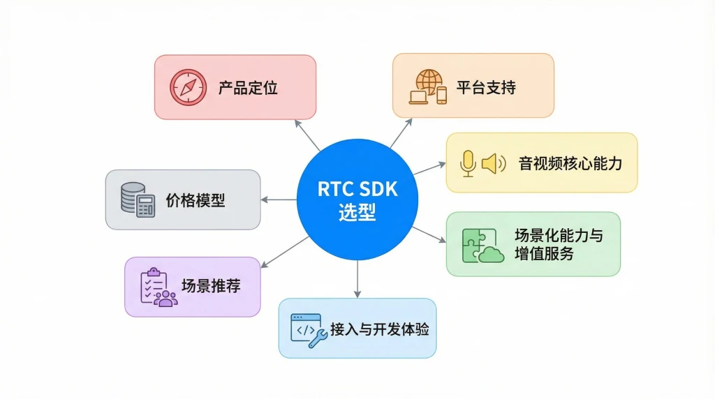 本文将从产品定位、平台支持、音视频核心能力、场景化能力与增值服务、接入与开发体验、场景推荐、价格模型等维度,对主流 RTC SDK 进行横向对比,帮你在选型阶段做出更有依据的决策。