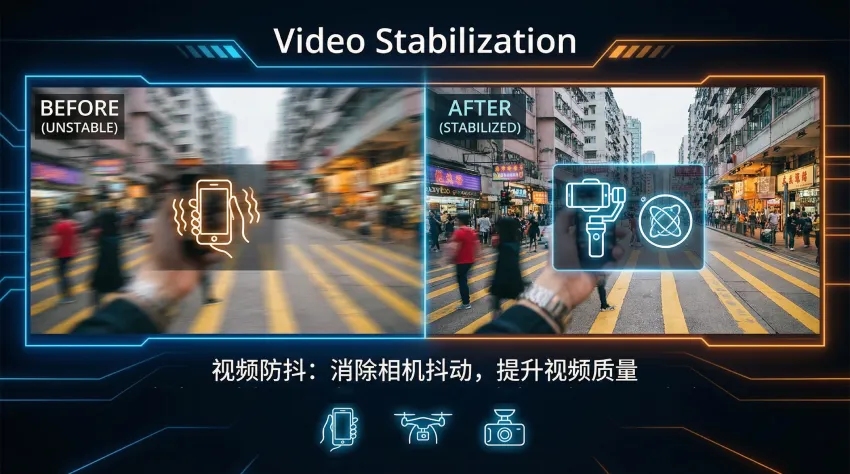 视频防抖是一项关键技术,它通过消除或减少因相机抖动造成的图像不稳定来提升视频质量,从而改善观看体验。该技术已深度应用于多种场景,包括手持录制、无人机航拍、车载监控等。