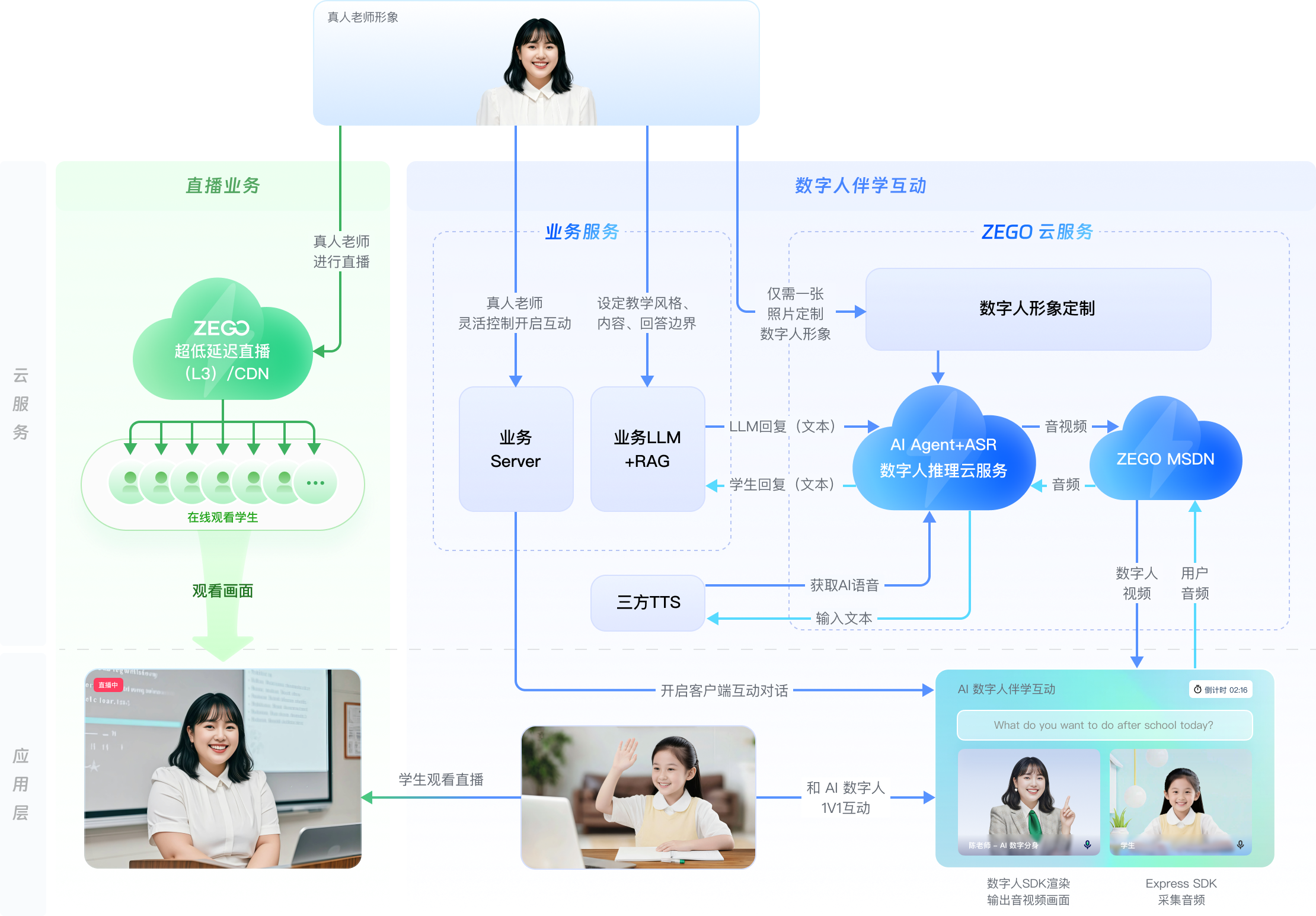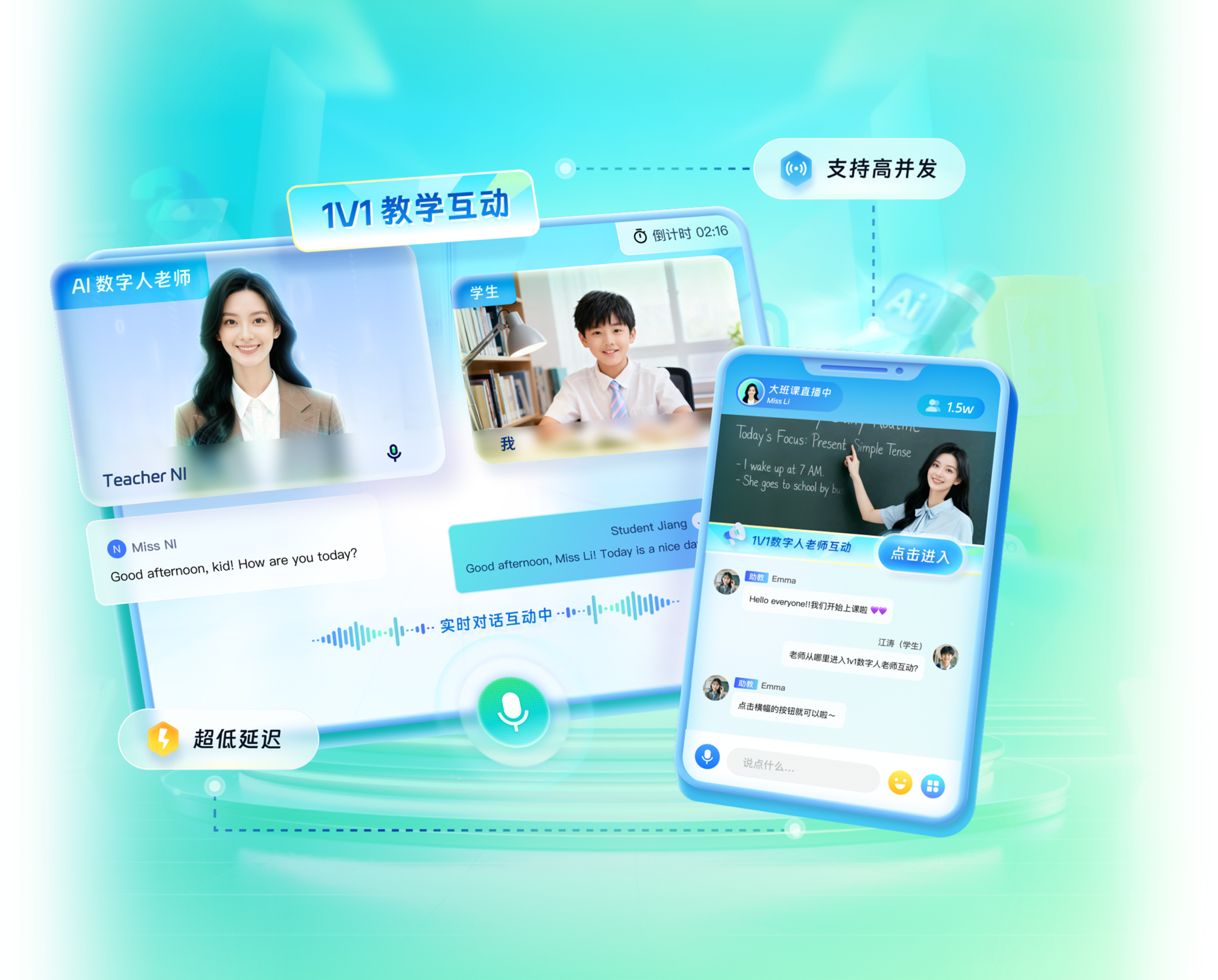 AI 数字人老师补充互动环节,支持万名学生同时交流,让所有学生都能参与实时互动